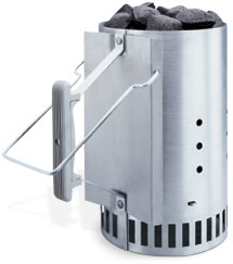 Den originale grillstarter fra Weber, der gør det nemt at få gang i kullene. Smart styre-/vippehåndtag, så du kan hælde kullene sikkert ned i grillen. Rummer fire kilo briketter.