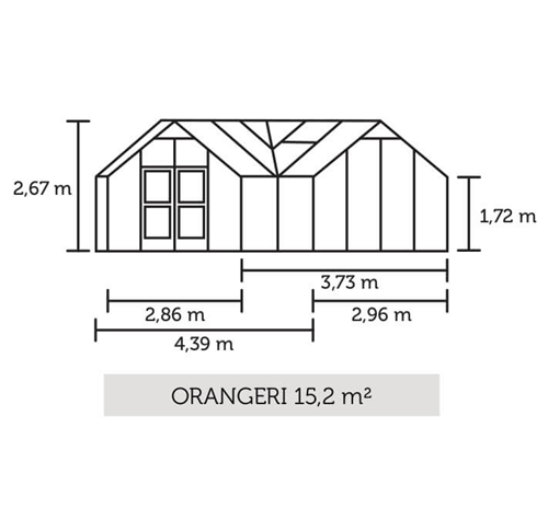 Juliana Orangeri fås i to farvevarianter: alu/sort og grå/sort og leveres med 3 mm sikkerhedsglas. Der kan tilkøbes et sortlakeret stålfundament, der gør det nemt at montere drivhuset.