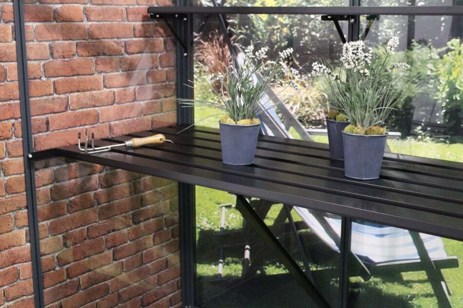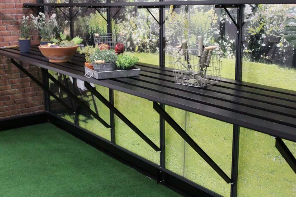Hvis der i dit drivhus er brug for meget bordplads, så er drivhusbordet med lameller en perfekt løsning. Bordet udnytter hele langsiden i drivhuset ved at gå fra gavl til gavl. Bordet består af seks baner med lameller, der er lavet i sort pulverlakeret aluminium, og som fastgøres på afstivningsprofiler, der nemt monteres i drivhusets tremmer.