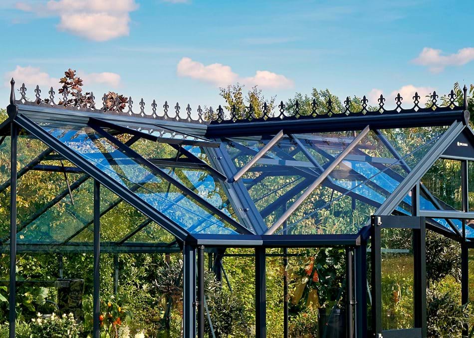 Tagudsmykning - også kaldet cresting - er oprindeligt udviklet for at forhindre fuglene i at sætte sig på tagryggen. Samtidig giver det drivhuset et klassisk udseende. Hvorvidt der skal tagudsmykning på dit drivhus, er helt op til dig. I Juliana sortimentet kan tagudsmykning tilføjes på Orangeri, Compact, Premium og Gartner.