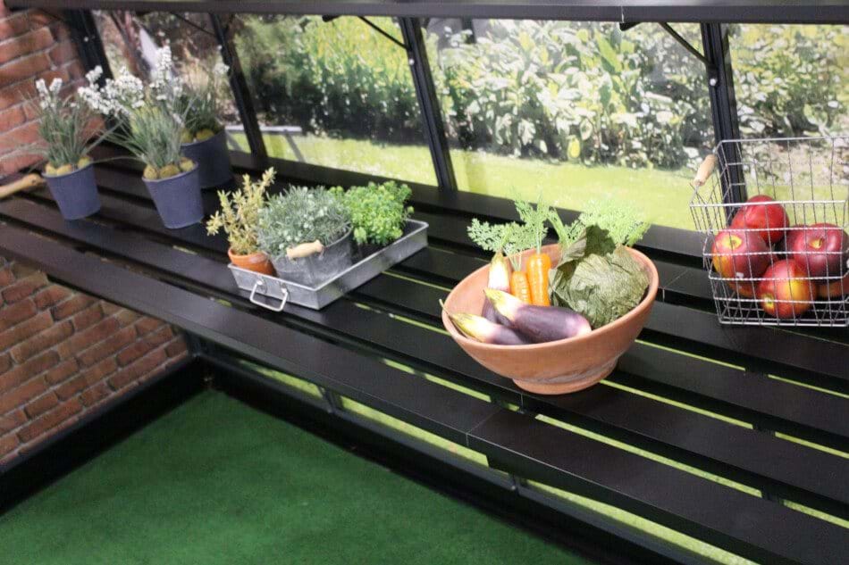 Hvis der i dit drivhus er brug for meget bordplads, så er drivhusbordet med lameller en perfekt løsning. Bordet udnytter hele langsiden i drivhuset ved at gå fra gavl til gavl. Bordet består af seks baner med lameller, der er lavet i sort pulverlakeret aluminium, og som fastgøres på afstivningsprofiler, der nemt monteres i drivhusets tremmer.