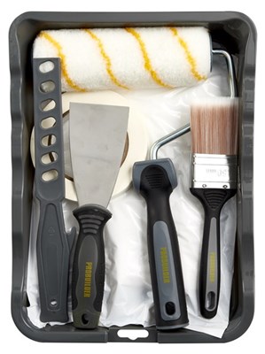 1 x 18cm malerbakke 1 x 18cm akryl malerrulle 1 x 18cm rulleskaft, softgrip, Ø8mm 1 x 50mm flad pensel 1 x 60mm spartel 1 x 2cmx50m maler tape 1 x 4x5m afdækningsfolie 1 x rørepind