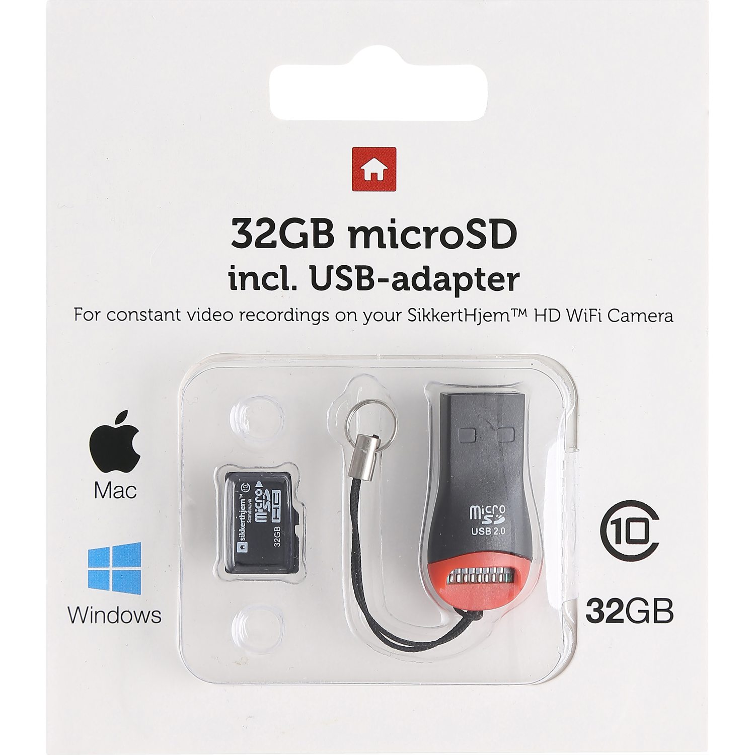 Ved at indsætte microSD-hukommelseskortet i et SikkertHjem HD WiFi kamera, kan du få kameraet til at foretage og gemme konstarte videooptagelser. Optagelserne gemmes automatisk på microSD-kortet hvert 20. minut. Når kortets hukommelse er fuld, overskrives de ældste optagelser automatisk. Den medfølgende USB-adapter benyttes til let at afspille de optagede video-sekvenser på din PC eller Mac.